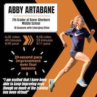 Abby started her outdoor season at the first USATF New England Youth Mini Meet, where she ran PRs of 1:09.53 for the 400m and 2:26.82 for the 800m. The following week, Abby competed at the first meet in the Battle Road Twilight Series, where she ran a personal best of 10:33.10 in the 3000m. When presented with the chance to compete at the third installment of the Battle Road Twilight Series, Abby took advantage of the opportunity, racing to a new 800m PR of 2:25.36. Her times qualified her for the freshman mile and 2 mile at New Balance Nationals, but she did not compete due to nagging injury.