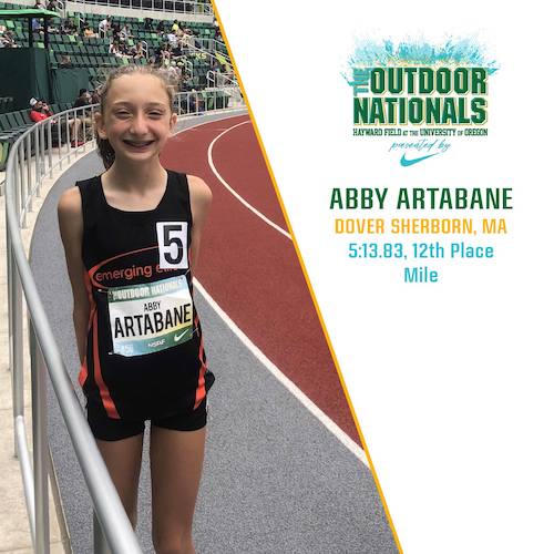 Abby Artabane raced in the girls middle school mile at NSAF Outdoor Nationals on July 2, 2021. In her first race at historic Hayward Field, Abby crossed the finish line in a solid 5:13.83. Abby's perfomance earned her a fantastic 9 second PR and clinched 12th place overall.