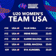 This year’s U20 team scorers are all high school athletes: a junior (Ellie), two seniors (Irene and Karrie) and a sophomore (Zariel), with a college freshman (Eva) and another HS junior (Allie) on the US squad. With the exception of Irene and Eva, the rest of the squad is age eligible to return on next year’s U20 XC team.