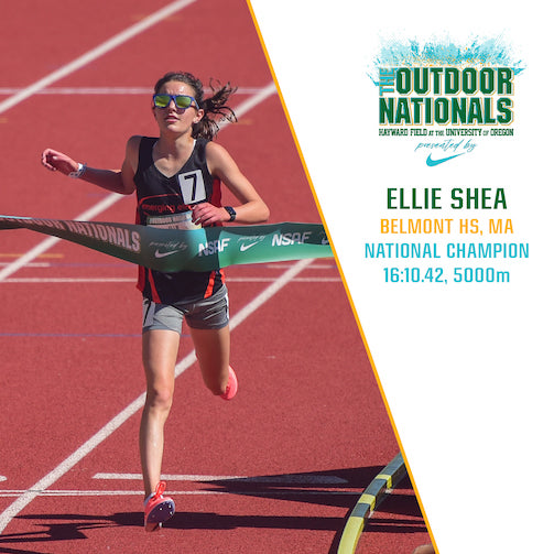 Entered in the Championship 5000m, 2 Mile and Mile, Ellie had lots of options for what she wanted to race at the NSAF Outdoor Nationals. She decided to make her 5000m debut at Hayward Field. Racing with fellow Emerging Elites teammate Margot Appleton and Caroline Wells of Florida, who both raced the Brooks PR Mile the prior day in Seattle, this trio quickly gained separation from the field by passing through the opening 1600m in 5:08, 3000m in 9:42 and 3200m in 10:21. Their 3200m time was only 2 seconds slower than the winning time of 10:19.95 for the Girls Championship 2 mile held later on Saturday afternoon and they still had 1800m of racing! Ellie made her move with 1200m remaining and really pushed the final kilometer at Hayward Field. Ellie raced to the line and accelerated through the winner’s breaktape, running 16:10.42 to win the Championship 5000m in her 5000m debut! Ellie’s last 1600m was covered in 5:10.
